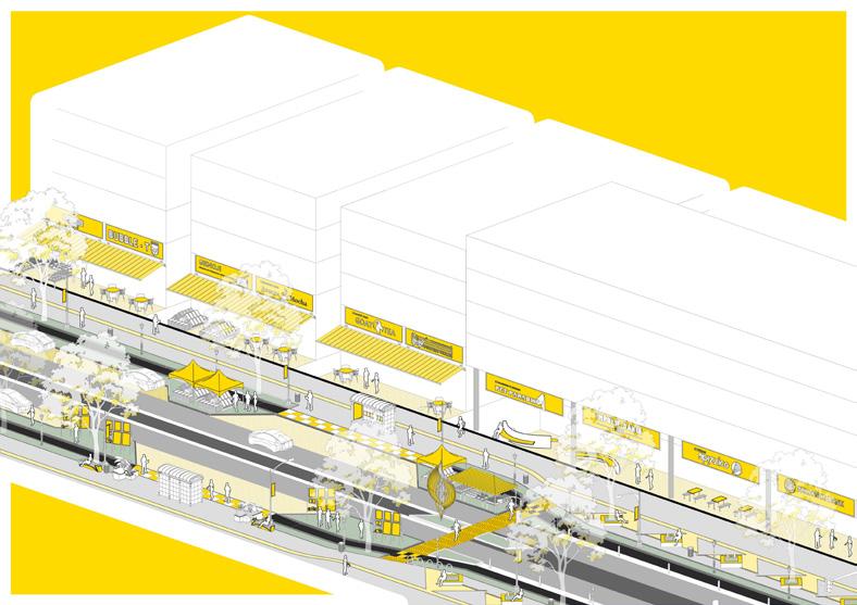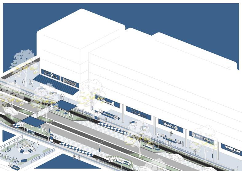 Pop-Up Event in McKinley Park (Front of Field House) Pop-Up Event in Playgarden Pop-Up Event On Memorial Day Parade (35th Street) Visioning WorkshopThe 35th and Archer intersection connects McKinley Park to the city through the CTA Orange Line and other transit options. Based on community feedback, this transit oriented development is a potential portal into and out of the neighborhood. The view shows a part of the parking lot being repurposed into a linear park to improve walking and biking connectivity surrounded by grab-and-go businesses. The sidewalks at the junction are extended, and the paving is modified to facilitate traffic calming. These interventions also respond to safety concerns related to road accidents, improving mobility around the L station.