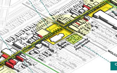 Housing the McKinley Park Library and the Walgreens store, this intersection is frequently visited by community members. The junction is envisioned as a “Social Hub” with multiple small businesses and flexible gathering spaces.