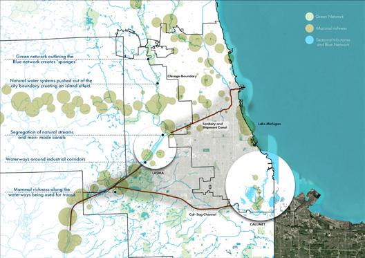 This studio we are expanding from one connection to address a larger conjunction of ecosystems and its impact on urban fabric, Situating chicago’s location in the larger canvas we see lake michigan (part of great lake) connecting mississippi through, chicago river, des plains and illinois.
