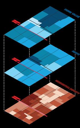 This map highlights the economic North- South divide in the Chicago region which shows a legacy of disinvestment on the south and west side. A high rate of housing vacancy is coupled with lower median household incomes between the two rivers (Chicago river and Cal-Sag river)