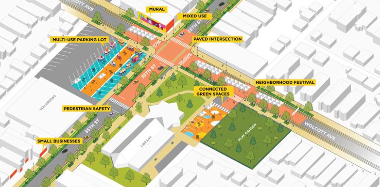 It repurposes the Walgreens parking lot as a station for food trucks with an extension into the library’s landscaped space. Wolcott Avenue is utilized as the Festival Street, which can host small street markets and block parties spanning 2 blocks in either direction from the McKinley Community Play Garden.