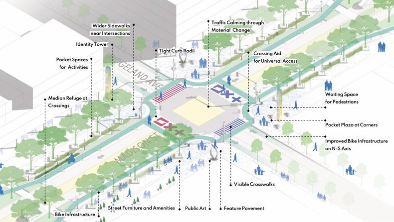 On Madison Made, expanded sidewalk space for outdoor retail amenities, parking spots at bus bulbs, popup market spaces along buffer zones, color-coded signage, and patterned crosswalks that bridge north and south sides of the street invite foot traffic to promote local businesses.