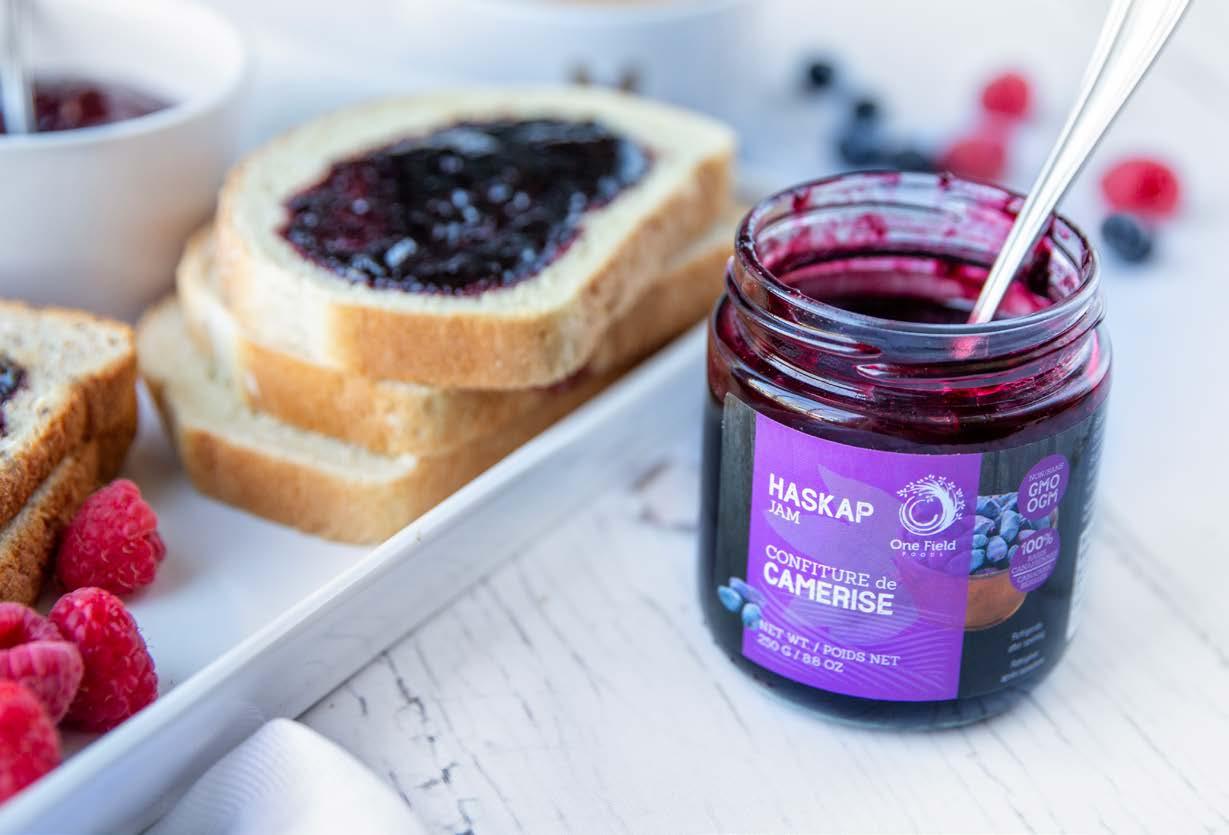 Sweet, delicious, and packed with more Antioxidants and Anthocyanins than blueberries. Haskap jam is the perfect partner for your toast, baked goods, or cheese plater.