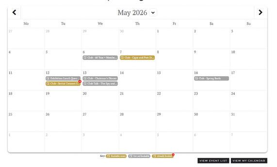 In the bottom right corner is a button saying ‘View Upcoming Events’, this will show all the events for Club members. As seen in the picture (right), if they are in grey they are not yet bookable but you can, of course, add them to your diary. If in gold, you can book them. And, if you are already booked in, they will be in gold but with a number on them for how many tickets you have booked.
