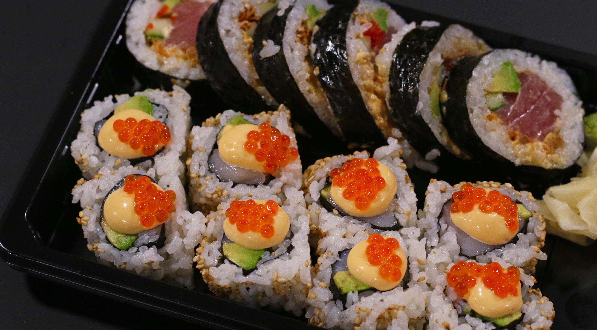 The Midnight Sun roll, front, is topped with chili mayonnaise and salmon roe in homage to the 24hour daylight that lasts from April to September in Svalbard.