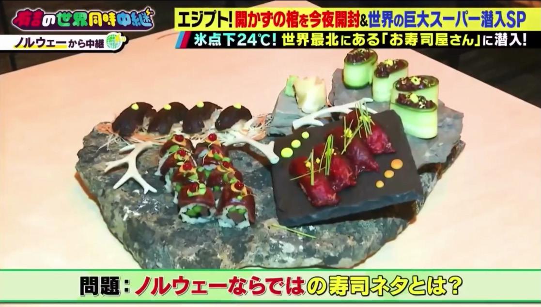 The station also bought Quiambao reindeer, seal and whale meat so he could prepare an Arctic sushi set for the program. The Tokyo cast perked up when this set emerged from the kitchen. “Kirei (pretty),” they cried as the camera panned the spread, arranged on a slate slab and adorned with antler fragments. “Tabetai (I want to eat it),” they groaned as the Norwegian guest bit into the seal nigiri, each slice of black flesh accentuated by a pearl of green