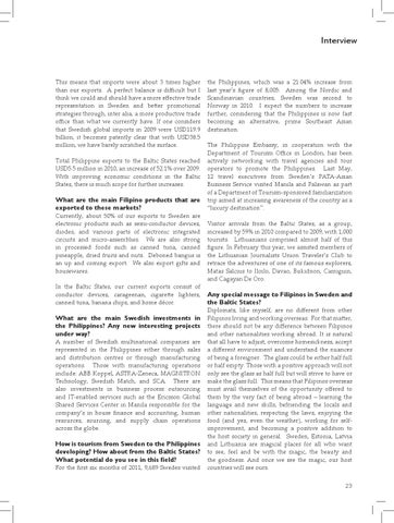 This means that imports were about 3 times higher than our exports. A perfect balance is difficult but I think we could and should have a more effective trade representation in Sweden and better promotional strategies through, inter alia, a more productive trade office than what we currently have. If one considers that Swedish global imports in 2009 were USD119.9 billion, it becomes patently clear that with USD38.5 million, we have barely scratched the surface. Total Philippine exports to the Baltic States reached USD5.5 million in 2010, an increase of 52.1% over 2009. With improving economic conditions in the Baltic States, there is much scope for further increases.