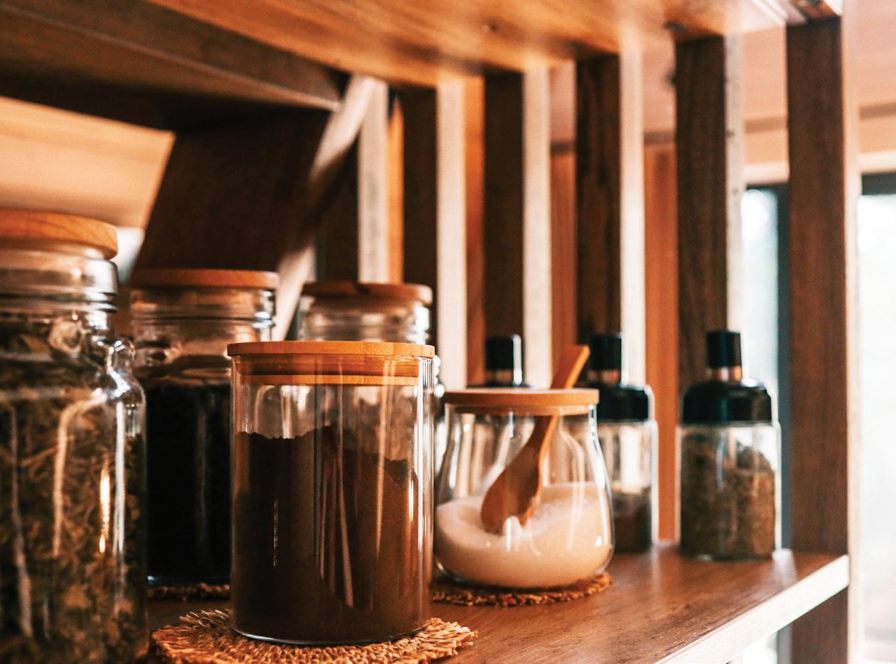Now what about wooden scoops? We show you how to put some polish into your pantry by using uniform class jars, ceramic canisters — perhaps made by local artisans — baskets and wooden scoops, which soften any space. Beautiful organization.