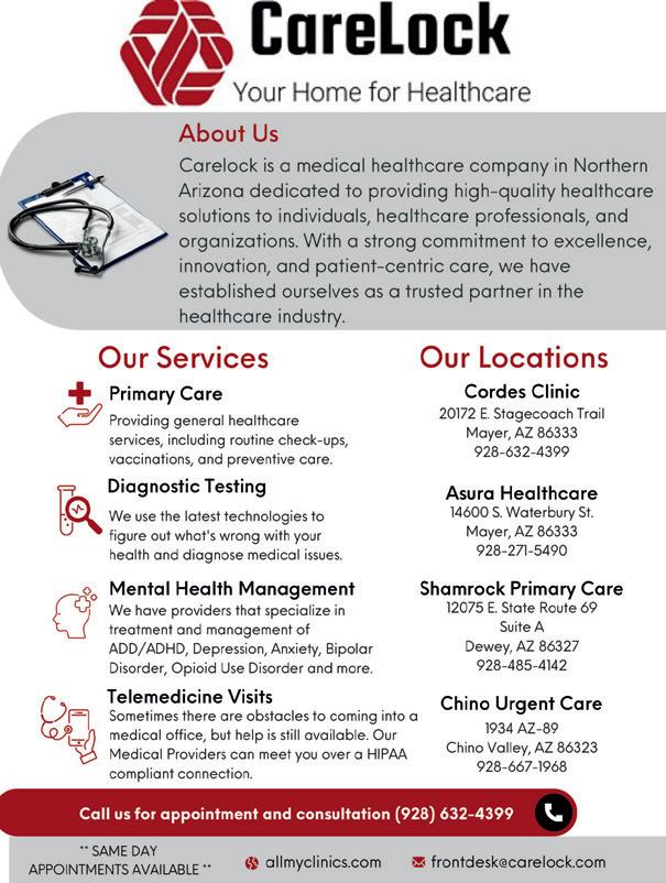 10 Prescott NOW Vol. 12, No. 4 PRESCOTT-NOW.COM Prescott NOW is published by ROX Media, LLC dba Raxx Direct Marketing. Editorial content is provided by affiliates of Raxx Direct Marketing, community members and local organizations. ©2024. All rights reserved. No part of this publication, including but not limited to editorial content, illustrations, graphics and photographic images, may be republished, reproduced or reprinted without the prior express written consent of the publisher. The publishers of Prescott NOW! assume no responsibility for errors or omissions of any advertisement beyond the actual cost of the advertisement. In no event shall the publishers be liable for any consequential damages in excess of the cost of the advertisement. Prescott NOW! shall not be liable for inaccuracies, errors, omissions, or damages from the use of information contained herein. Submitted articles do not reflect the opinions of the owners or management of ROX Media, LLC. Information contained within submitted articles had not been verified for accuracy and readers are responsible for forming their own opinions. EQUAL HOUSING OPPORTUNITY: All real estate advertising in this publication is subject to the Federal Fair Housing Act of 1968 and its amendments that make it illegal to advertise any preference, limitation or discrimination based on race, color, religion, sex, handicap, familial status or national origin, or an intention to make any such preference, limitation or discrimination. This publisher will not knowingly accept any advertising for real estate that is in violation of the law. Our readers are hereby informed that all dwellings advertised in this magazine are available on an equal opportunity basis. Real estate information is accurate at time of press and subject to current availability and pricing. CQE CEO Elaine M. Earle, CPA Vice President, Operations Bea Lueck
