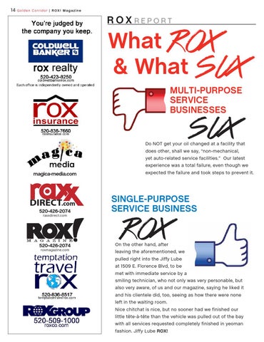 ROX On the other hand, after leaving the aforementioned, we pulled right into the Jiffy Lube at 1509 E. Florence Blvd, to be met with immediate service by a smiling technician, who not only was very personable, but also very aware, of us and our magazine, saying he liked it and his clientele did, too, seeing as how there were none left in the waiting room. Nice chitchat is nice, but no sooner had we finished our little tête-à-tête than the vehicle was pulled out of the bay with all services requested completely finished in yeoman fashion. Jiffy Lube ROX!