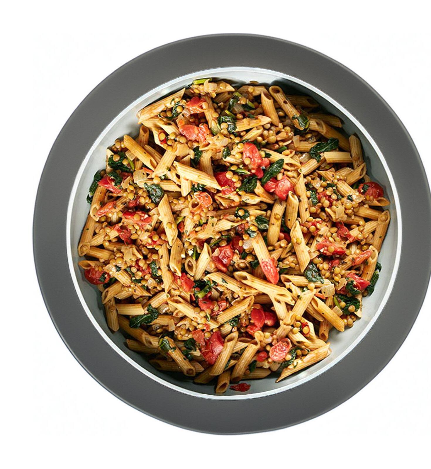 3. To the pan, add lentils, pasta, crushed tomatoes, 2½ cups (600 milliliters) water, salt, black pepper, oregano and basil.