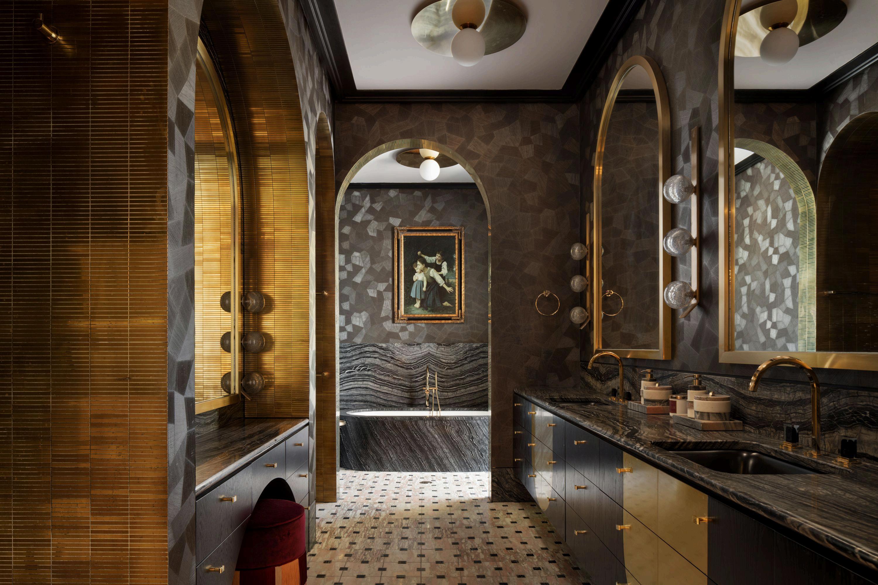 The interiors feature bold, rounded forms and fluted stone, parquetry and patterned tiling, while thoughtfully designed cabinetry and generous proportions maintain the sense of limitless space throughout every room