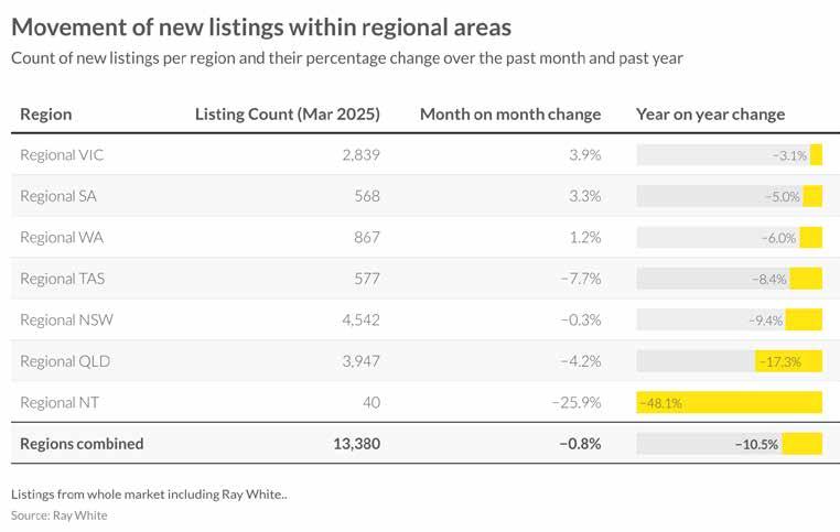 Regional listing activity showed a contrasting pattern to metropolitan markets in March, with combined regional areas recording 13,380 new listings. This represents a marginal 0.8 per cent monthly decline and a more substantial 10.5 per cent decrease compared to March 2024.