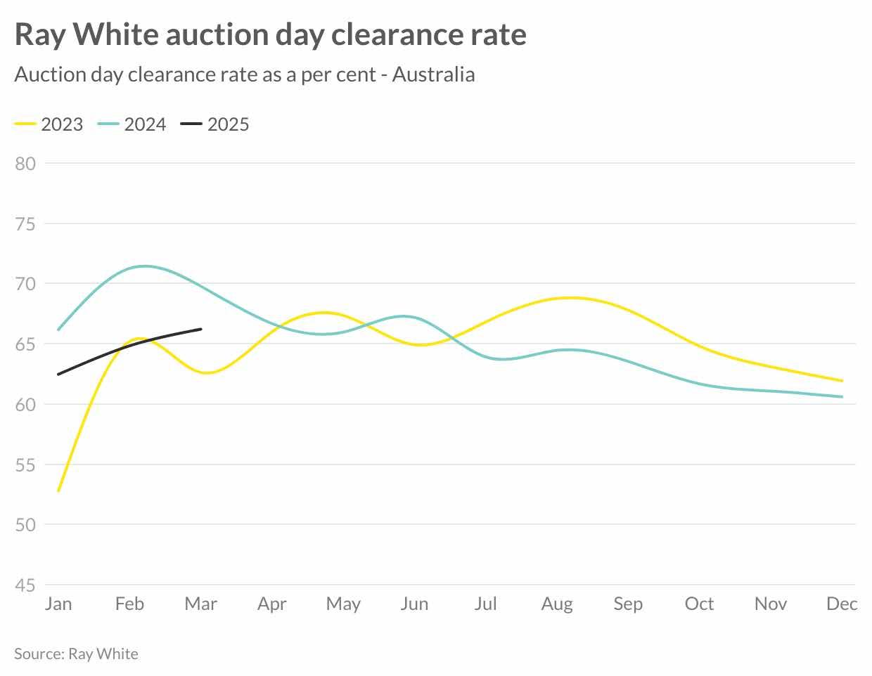 Auction clearance rates stabilised in March at 66.0 per cent, showing a moderate increase from February’s performance. While this represents an improvement over 2023 figures for the same period, it remains below the exceptionally strong levels seen in early 2024. The trend line indicates a consistent performance trajectory through the first quarter of 2025, with clearance rates sitting between those recorded in 2023 and the peak period of early 2024.