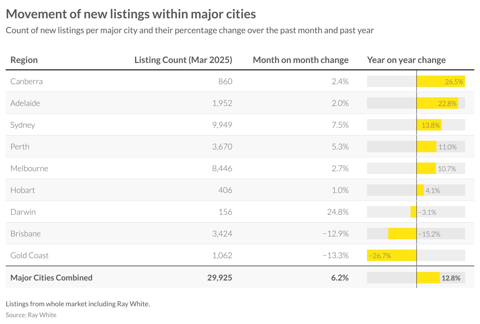 Major cities recorded 29,925 new properties in March, representing a 6.2 per cent increase from February and a substantial 12.8 per cent growth compared to March 2024. This strong year-on-year improvement indicates renewed seller confidence across metropolitan markets.