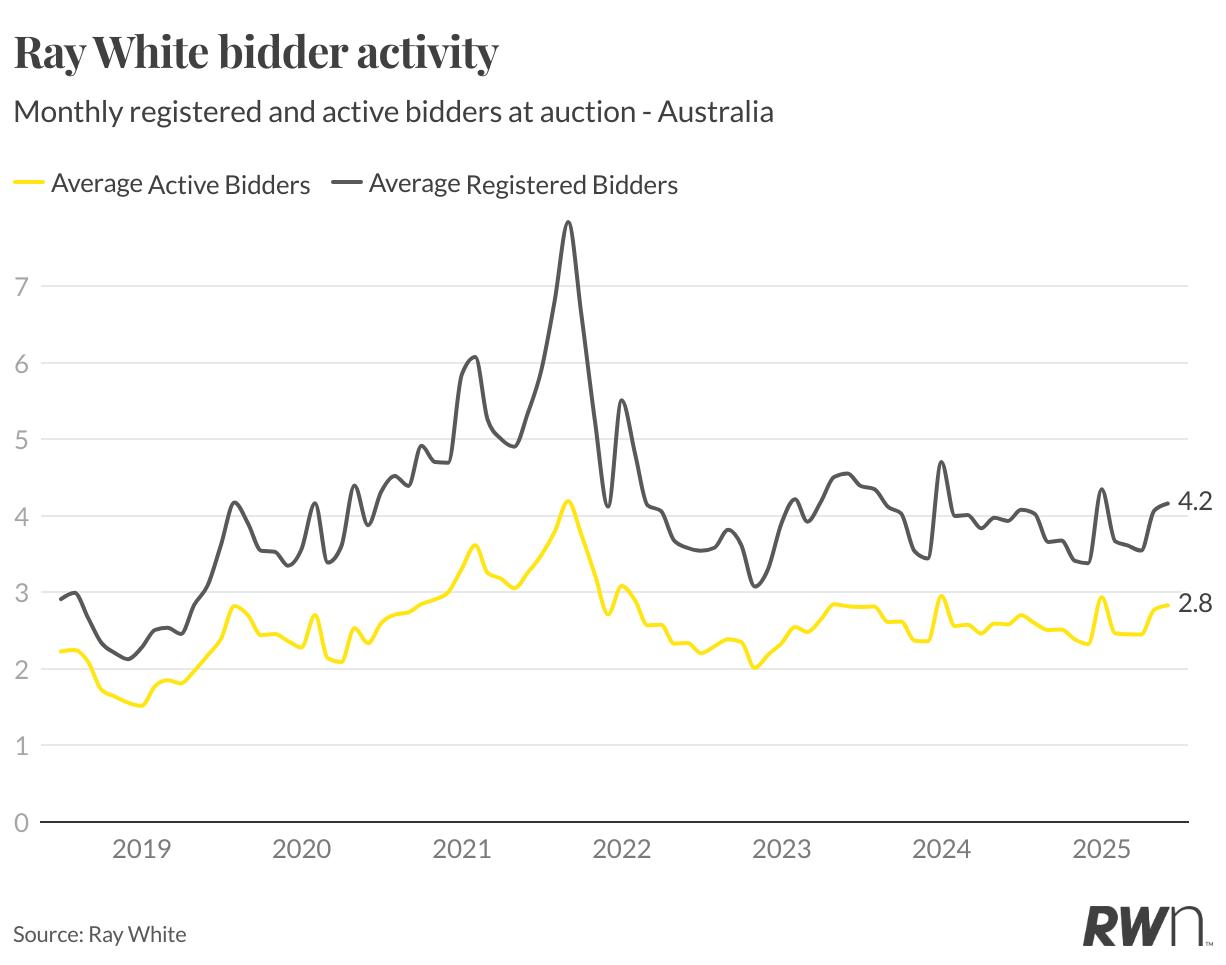 Bidder participation at Ray White auctions maintained steady levels in June, with registered bidders averaging 4.2 per property and active bidders at 2.8 per auction. These figures represent consistent engagement patterns established through 2025, with approximately 67 per cent of registered participants actively competing in the bidding process.