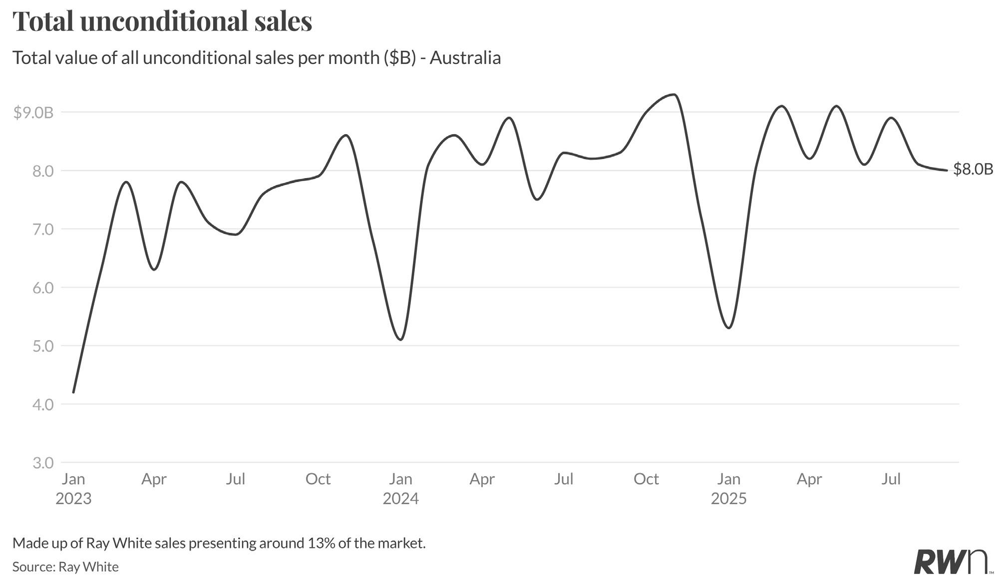 Ray White’s unconditional sales reached $8.0 billion in September, maintaining the elevated performance levels established through winter and spring 2025. This result positions September 2025 ahead of the corresponding periods in both 2023 and 2024, demonstrating sustained transaction momentum despite the broader economic headwinds and elevated interest rates.