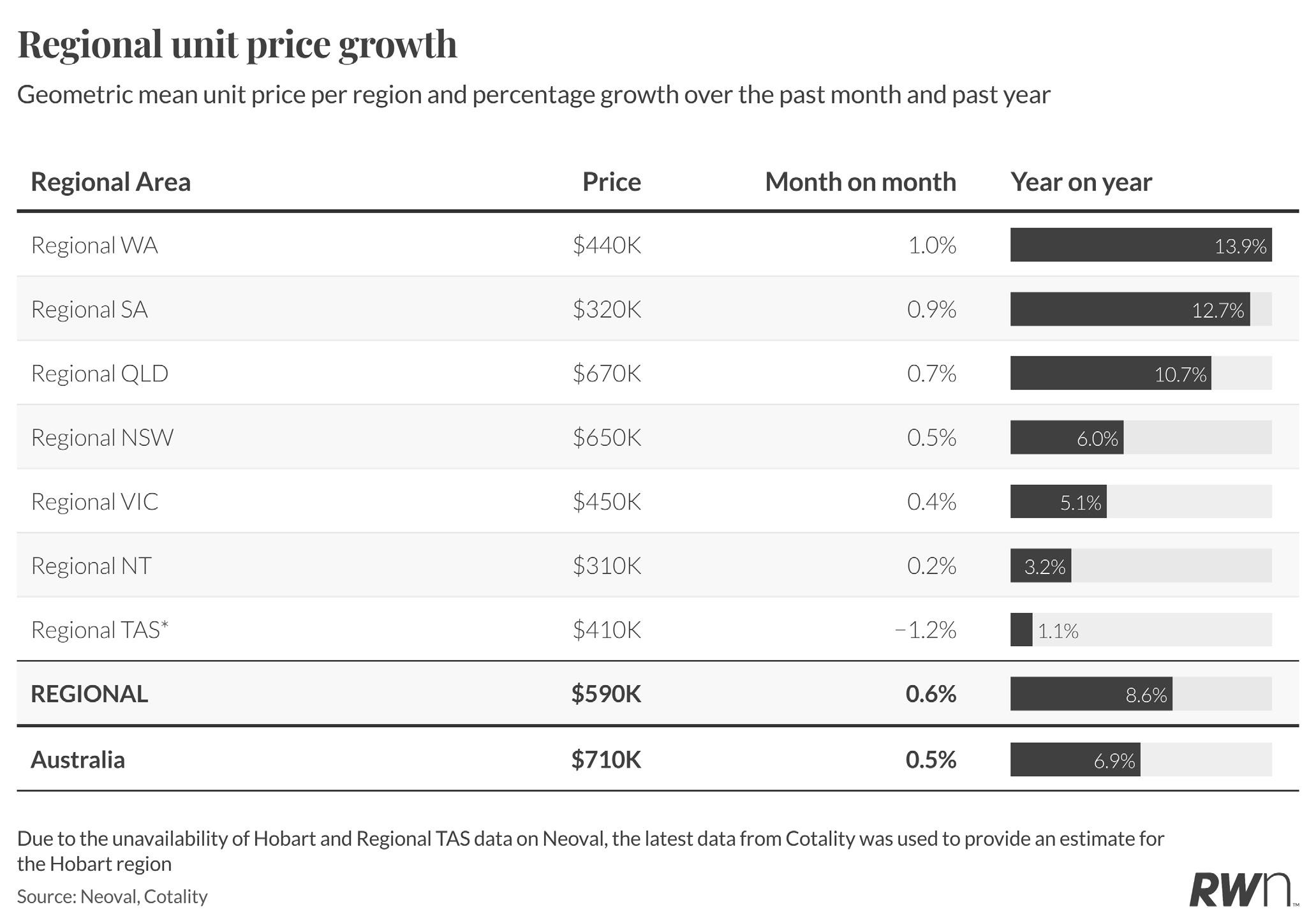 Regional Western Australia continues to dominate the regional unit sector, posting a 1.0 per cent monthly increase and impressive 13.9 per cent year-on-year growth, with units now averaging $440,000. Regional South Australia follows with 0.9 per cent monthly growth and 12.7 per cent annually, reaching $320,000, demonstrating the ongoing appeal of more affordable regional markets.