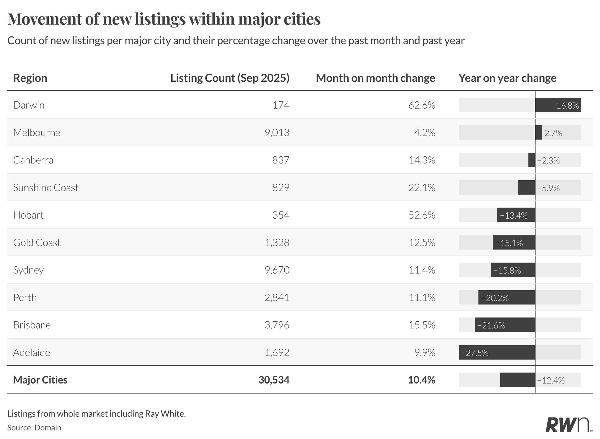 However, most major cities show significant year-on-year declines, with Adelaide down 27.5 per cent to 1,692 listings despite a 9.9 per cent monthly increase. Brisbane fell 21.6 per cent annually to 3,796 listings, Perth declined 20.2 per cent to 2,841 properties, and Sydney dropped 15.8 per cent to 9,670 listings. The Gold Coast recorded a 15.1 per cent annual decline to 1,328 listings. Combined major cities reached 30,534 listings with a 10.4 per cent monthly increase, though annual figures remain 12.4 per cent below September 2024 levels, highlighting the persistent supply constraints affecting metropolitan markets.