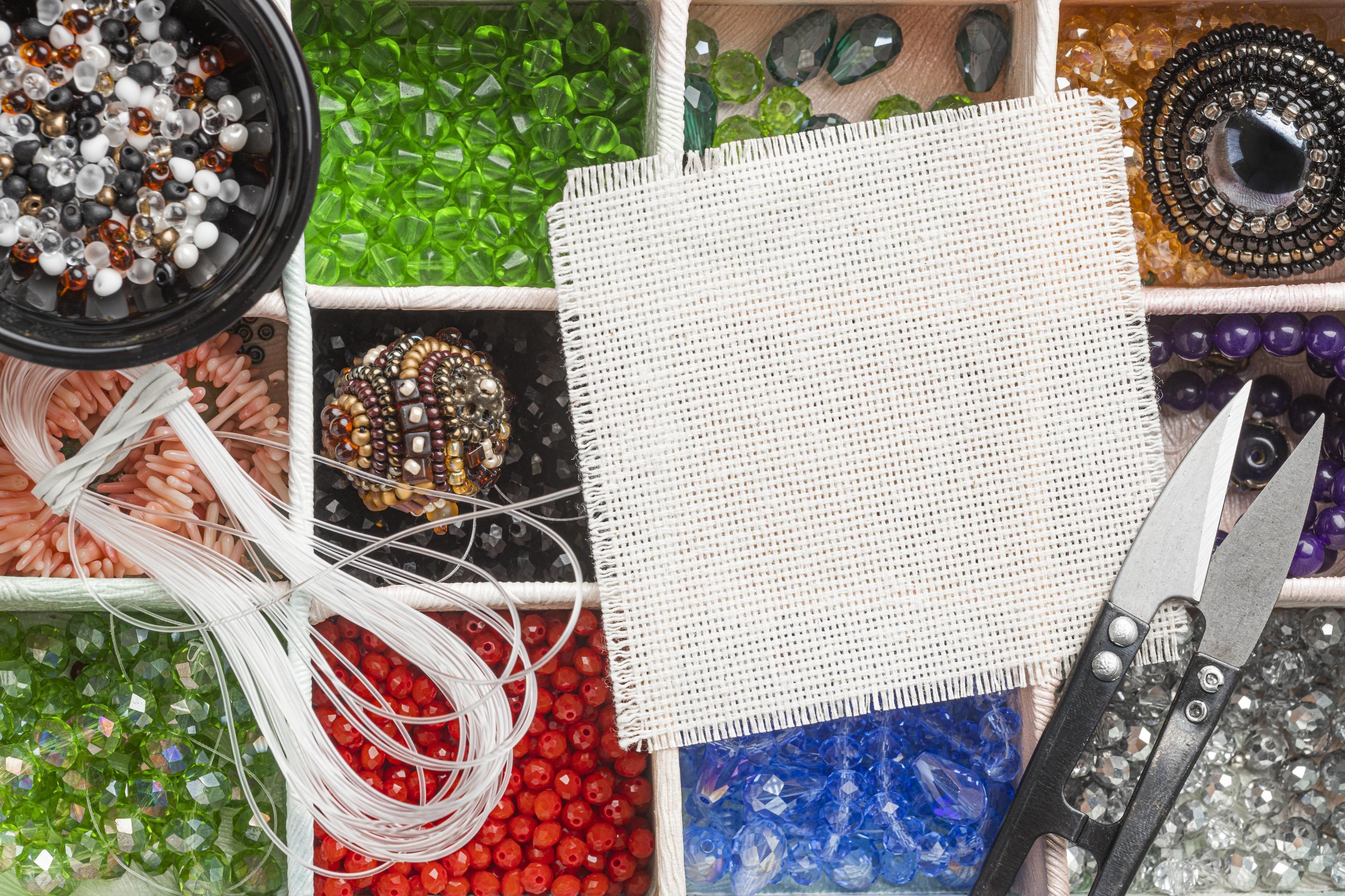 Beads are essential for adding texture and elegance to embroidery designs. The collection includes glass beads, cut beads, pearl beads, tube beads, and antique beads in various colors and sizes. These beads are widely used for creating detailed patterns and enhancing the richness of Aari work