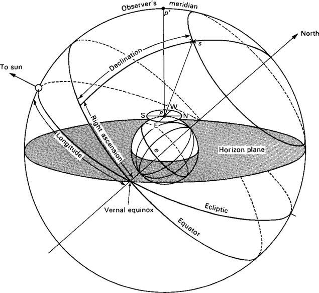Sincethevernalequinoxrepresentsafixedpointonthecelestialsphere, weusethispointastheoriginofacoordinatesystemtowhichwecanrefer thepositionsofstars.Supposeanobserveratpoint p observesastaratpoint s onthecelestialsphere.Wecanimagineagreatcirclerunningfromnorththrough thestartothecelestialequator.Wedefinetheanglebetweenthiscircleand thecirclegoingthroughthevernalequinoxastherightascension(RA)ofthe star.ForreasonsexplainedinChapter2,rightascensionismeasuredinhours,