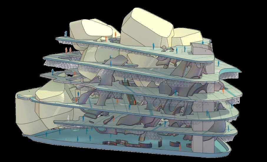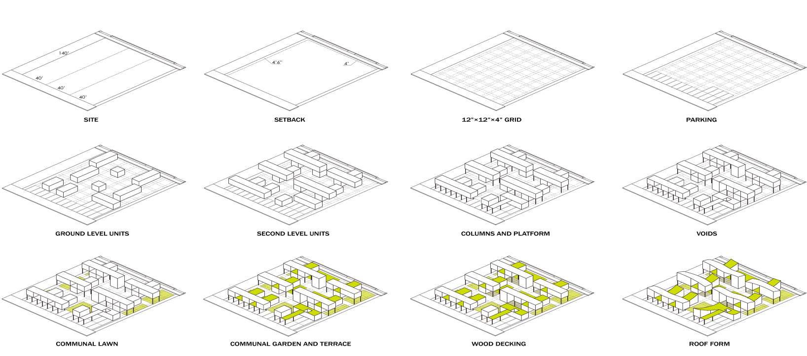 Drawing inspiration from Stan Allen's field conditions, this architectural project adopts a lattice concept that begins with an empty site and generates a grid on the site. The lattice system is used to organize spaces and circulation paths, creating a dynamic and interconnected community. By utilizing the grid as a flexible framework, the design allows for a diverse range of unit types and sizes, accommodating a variety of lifestyles and needs. This approach aims to create a sense of order and coherence while also fostering a sense of spontaneity and improvisation, enabling residents to adapt and personalize their living spaces. Ultimately, the lattice concept offers a unique and innovative approach to community design that prioritizes flexibility, adaptability, and connectivity.
