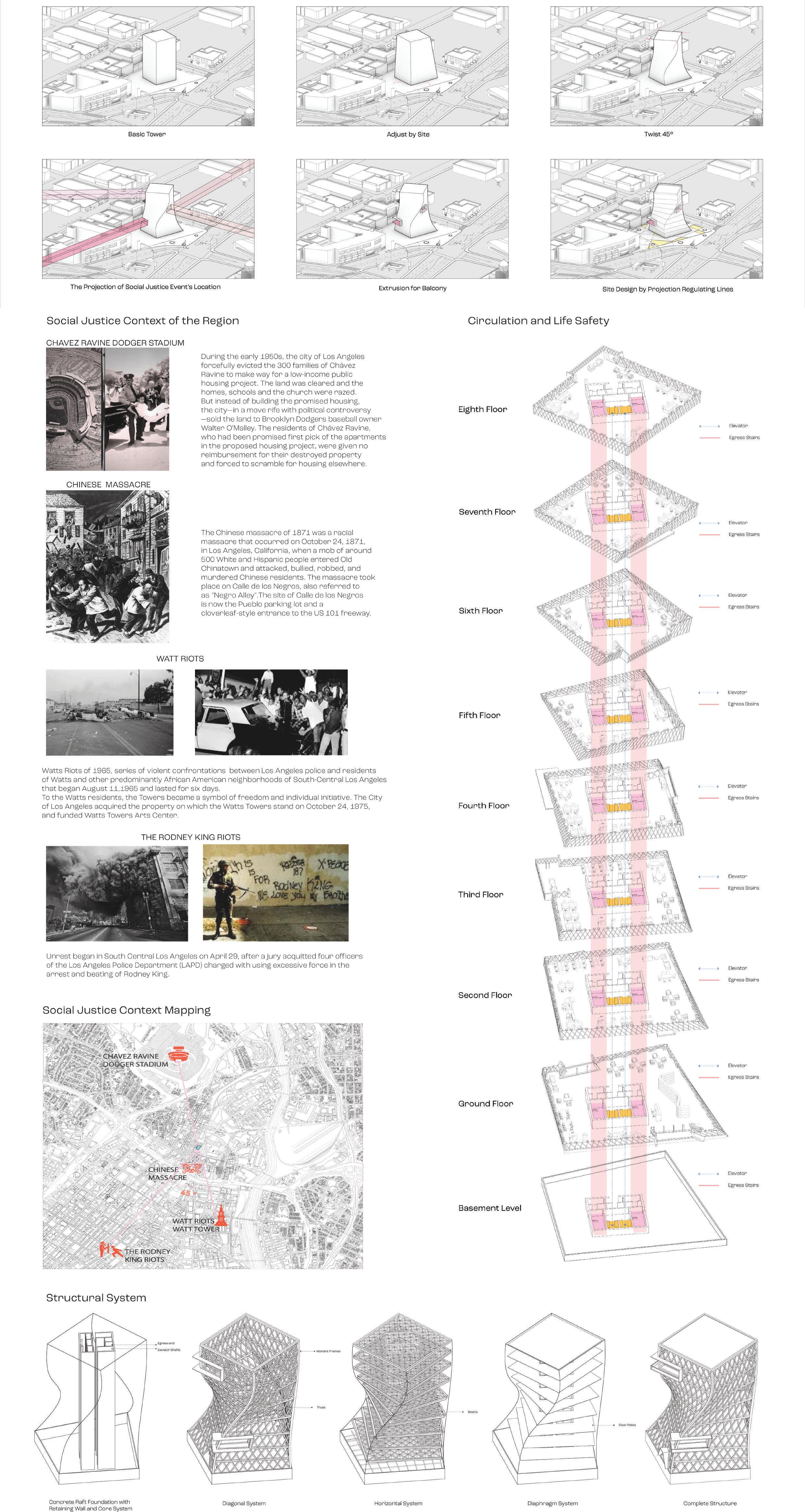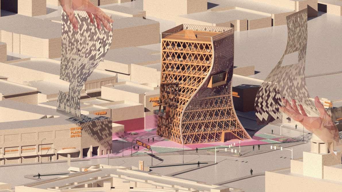 The USC Social Justice Center located in Chinatown at 747 N Main Street is a twist tower constructed with heavy timber that incorporates memorial facades for historical social justice events in Los Angeles, with observation decks embedded on each of the four facades to encourage engagement and education, creating a dynamic and sustainable space for community empowerment.