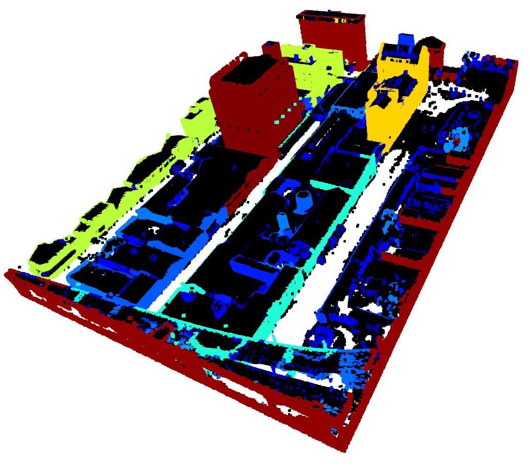 5: Segmented point cloud, automatically segmented into buildings, vegetation and ground points.