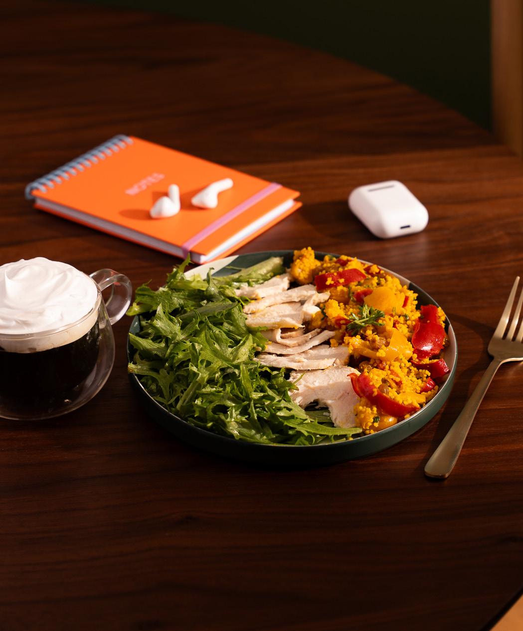 Chicken with lightly spiced Moroccan-style cous-cous, grilled peppers, chickpeas, sultanas and lettuce.