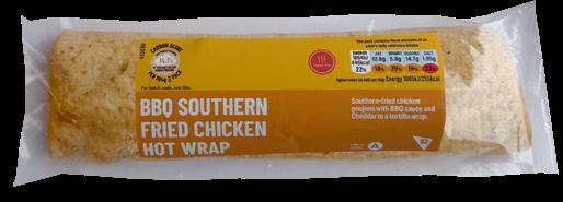 Southern fried chicken goujons with BBQ sauce and Cheddar in a tortilla wrap.