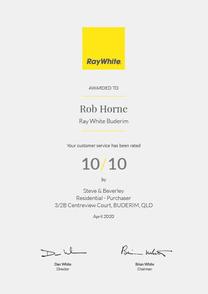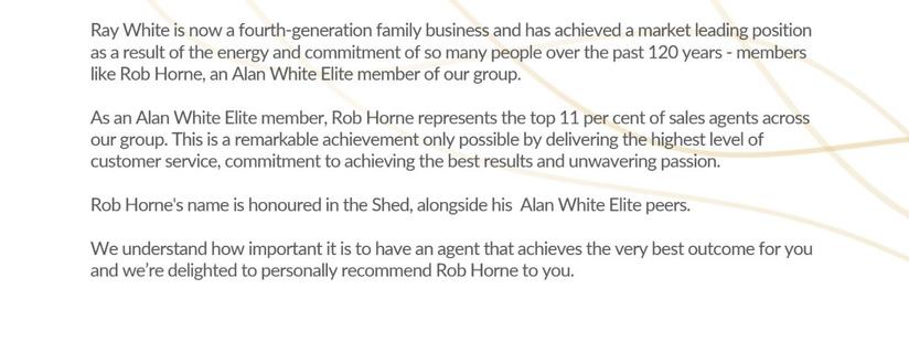 Therearetwoclassesofsalespeopleweallhaveexperienceofandthey areforcarsandhouses Thehorrorstoriesfaroutnumberthepositive oneswithmostpeopleabletorelateseveralexamples Itisimportant thereforetotakethetimetopubliclyacknowledgegreatprofessional serviceandIwouldliketodothattodayforRobandSallyHornefrom Ray White. Ray White have seemingly been with us forever and you don'tstayintheirpositionbyprovidingpoorservice Theyareofcourse asgoodasthepeoplewhoworkforthem