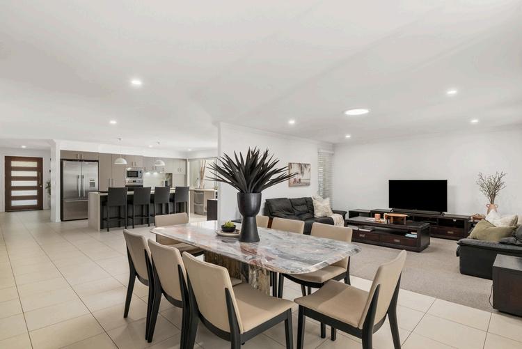 Step inside this beautifully presented, modern low-set family home at 3 Bandaroo Street, and be immediately captivated by its spacious open-plan design This fourbedroom property boasts a large central kitchen with an island bench that seamlessly flows into the d ning and living areas, creating the perfect space for family gatherings or entertaining guests. The kitchen extends to an alfresco area through a convenient breakfast bar, offering an idea setting for outdoor dining and relaxation The home is thoughtfully designed with multiple indoor and outdoor living areas, all facing north to maximise the sun's warmth and ight throughout the day