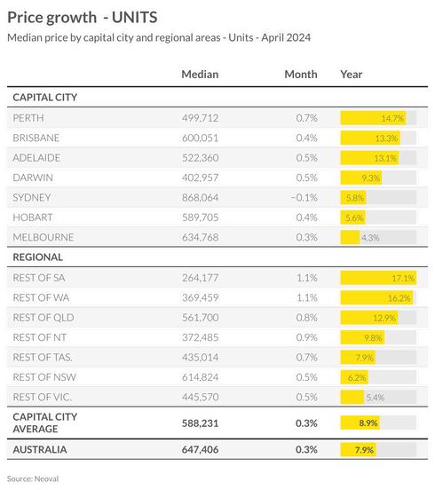 Price growth continued again in April with Perth and regional Western Australia seeing the strongest price growth in the country Over the month, Sydney units were the only market where we saw a slight decline in prices Year-on-year we are seeing prices increase in every suburb of the country