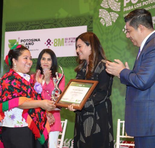 A nombre de la sociedad potosina, el Jefe del Poder Ejecutivo entregó una estatuilla y una constancia a cada una de las galardonadas como Potosina del Año, edición 2023, a la representante de la zona Centro, Mariana Hernández Noriega; de la zona Huasteca, Estela Hernández Martínez; de la zona Altiplano, María del Carmen Mata Carrera y Ana Luisa Martínez Zúñiga, representante de la zona Media, por su contribución a la construcción del nuevo San Luis Potosí.