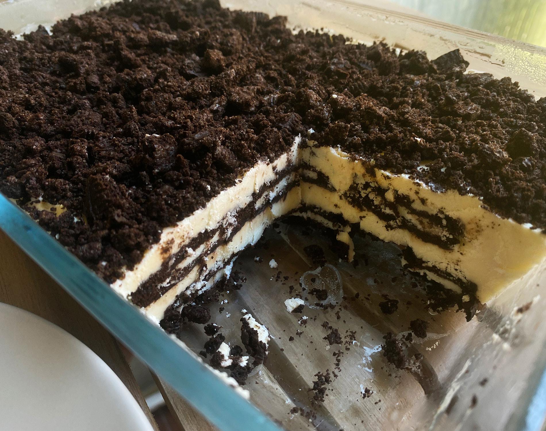 CUBRE con plástico un molde redondo. Cubre la base con galletas y añade la crema.