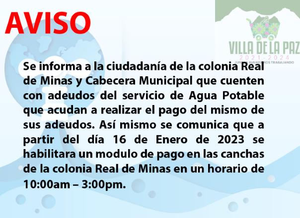 El Ayuntamiento de Villa de La Paz llamó a los usuarios de agua potable para que paguen puntualmente el servicio y los adeudos que tengan, incluso hasta anunció que se instalará un módulo de pago en la Colonia Real de Minas.