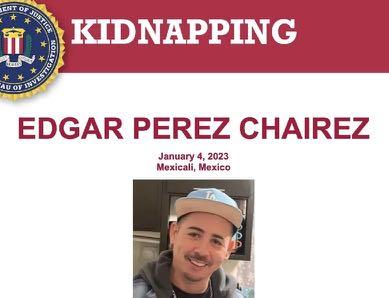 De la Redacción El Buró Federal de Investigaciones (FBI, por sus siglas en inglés) ofreció una recompensa de 10 mil dólares a quien proporcione información que lleve al rescate de Edgar Pérez Chairez, Polvos, un mecánico de 35 años que fue secuestrado en Mexicali, Baja California. La agencia de investigación estadunidense dio a conocer que Pérez Chairez fue secuestrado cerca de la esquina de la avenida Tabasco y la calle Chilpancingo, en Mexicali el 3 de enero de 2023. De acuerdo con la ficha expedida, Pérez nació el 22 de marzo de 1988 y mide