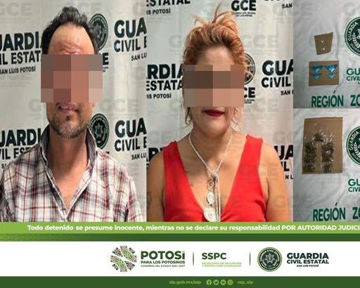 Matehuala, S.L.P.Como parte del Plan Integral de Seguridad implementado en los 58 municipios de la entidad potosina por la Guardia Civil Estatal para inhibir la comisión de ilícitos, se aseguró a una pareja en el municipio de Matehuala con varias dosis de droga. El aseguramiento se dio en la calle de General Leandro Sánchez, de la colonia Luis N. Morones del municipio señalado, donde elementos de la Guardia Civil Estatal al encontrarse en recorridos de seguridad y vigilancia dentro del plan estratégico de seguridad contra la delincuencia organizada y el narcomenudeo, ubicaron a la