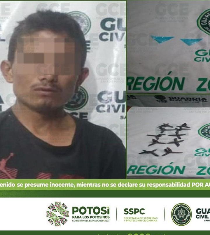 Matehuala, S.L.P.-Como parte de las acciones contundentes en materia de seguridad en todo el estado de San Luis Potosí, elementos de la Guardia Civil Estatal detuvieron a un joven que llevaba consigo varias dosis de estupefacientes y artefactos metálicos conocidos como “poncha llantas”. En los recorridos que efectúa la Guardia Civil Estatal en la zona #Altiplano para inhibir la comisión de ilícitos, agentes estatales lograron detener a Guadalupe de 25 años de edad sobre la avenida de Las Torres y Simón Bolívar en la colonia