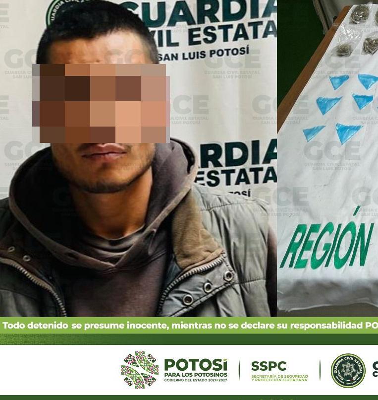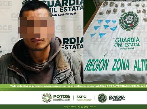 Matehuala, S.L.P.Agentes de la Guardia Civil Estatal lograron la detención de un hombre identificado como presunto distribuidor de droga e integrante de un grupo criminal generador de violencia en la zona de Matehuala.