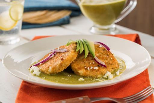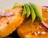 Rellena con el caldo de pollo, cocina hasta que se reduzca a la mitad y rectifica sazón. Licúa la preparación anterior hasta obtener una salsa. En un plato sirve un espejo de salsa coloca las tortitas encima, decora con un abanico de aguacate, la cebolla morada, y el queso panela. Disfruta.