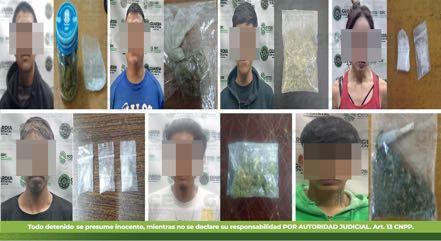 S.L.P.- En aras de combatir el delito de narcomenudeo en el Estado de San Luis Potosí, y para garantizar a la ciudadanía entornos de paz y tranquilidad, agentes de la Guardia Civil Estatal detuvieron a 11 masculinos y dos féminas luego de asegurarles diversas cantidades de droga entre sus pertenencias, en las cuatro regiones. En la capital potosina, fueron detenidas 7 personas: