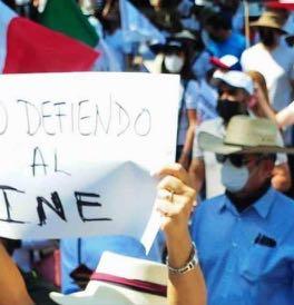 “Decimos no a la destruc ción del INE, no a la destruc ción de los institutos locales, no a la destrucción de los tri bunales locales, no a la pre tensión de alinear a los órga nos electorales a la voluntad del gobierno, no al autoritaris mo, si a la democracia, si a un México democrático”, señaló mientras muchos coreaban “yo de endo al INE”.