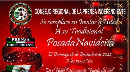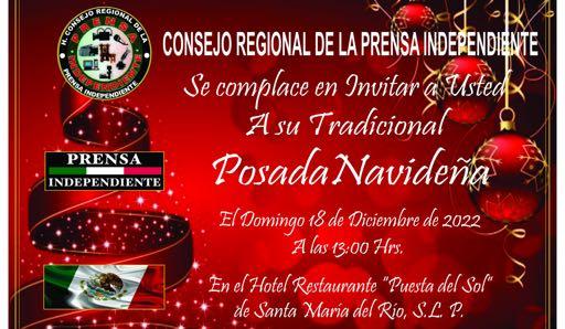 San Luis Potosí, S.L.P. Será el próximo 18 de diciembre del presente año que se lle ve a cabo la posada navide ña del Consejo Regional de Prensa Independiente, por lo cual quienes conforman este consejo hace una invi tación cordial a reporteros y camarógrafos de munici pios y estados circunveci nos a compartir el pan y la sal además de pasar un rato de convivencia con los com pañeros del medio.