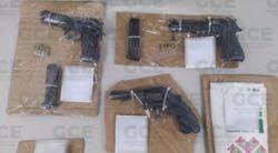 Al llegar al lugar, los ele mentos de la GCE y auto ridades periciales consta taron que en el interior del costal se encontraban dos armas de fuego calibre 9 mm., un arma de fuego tipo revólver, calibre 38 especial, dos cargadores y 35 cartu chos útiles; armamento que