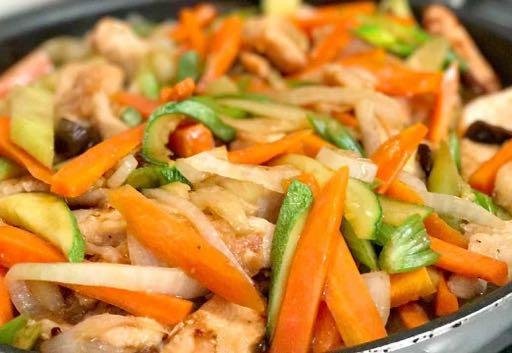 1. Calienta el aceite y fríe la cebolla con el ajo hasta que cambien de color, añade la pechuga de pollo y cocina por 5 minutos o hasta que dore ligeramente. Cocina