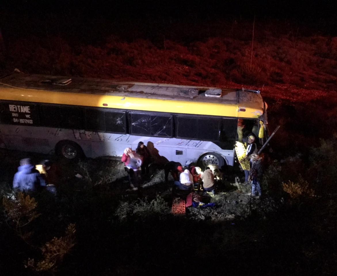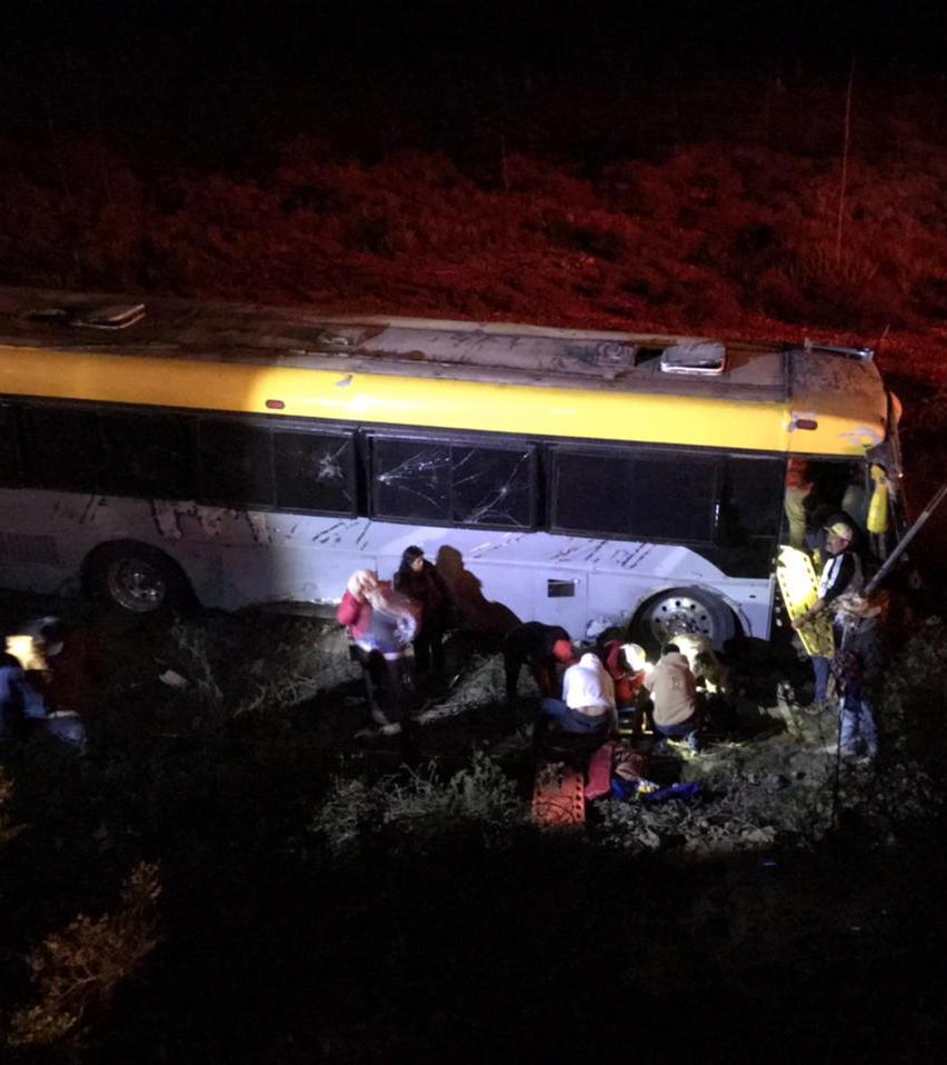 La Coordinación Estatal de Protección Civil infor ma que este domingo se registró un accidente de tránsito en el camino em pedrado a Real de Cator ce 4 kilómetros antes de llegar a la carretera 62, a la altura de Las Majadas. Al lugar acudieron a pres tar auxilio dos ambulan cias de la Cruz Roja y una ambulancia de Protec ción Civil de Matehuala, otra de Cedral y una más de Vanegas. Se informa que en el auto bús viajaban 45 personas, 38 personas policontun didas, siete lesionados de gravedad fueron ingre sados al Hospital General de Matehuala, los otros 38 son atendidos entre los hospitales de la clíni ca 14 del IMSS, el ISSSTE y Centro Médico del Alti plano en Matehuala.