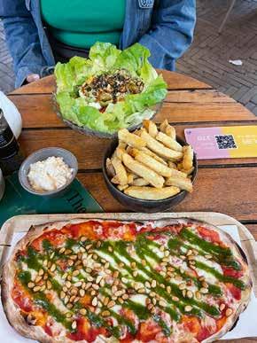 ETEN Mijn tafelpartner kiest de pizza margheri ta, met een huissaus van mozzarella, gerooster de pijnboompitten en pesto. De pizza valt op door de ovale vorm, zodat je niet bij elke hap een stuk korst hebt en je makkelijk kunt delen. Ik bestel de Burrata-salade met groene olijven, gerookte aman del, gepofte paprika, citroen en basilicumolie. De hoeveelheid burrata en zachte citroensmaak verrassen mij. Als bijgerecht nemen we friet met Dijon-mayonaise. We ronden af met wortel- en appeltaart. Heerlijke taartpunten, maar wel te groot voor ons. We drinken een latte macchiato en chocolademelk erbij en krijgen ook nog gratis water met chocolaatjes.