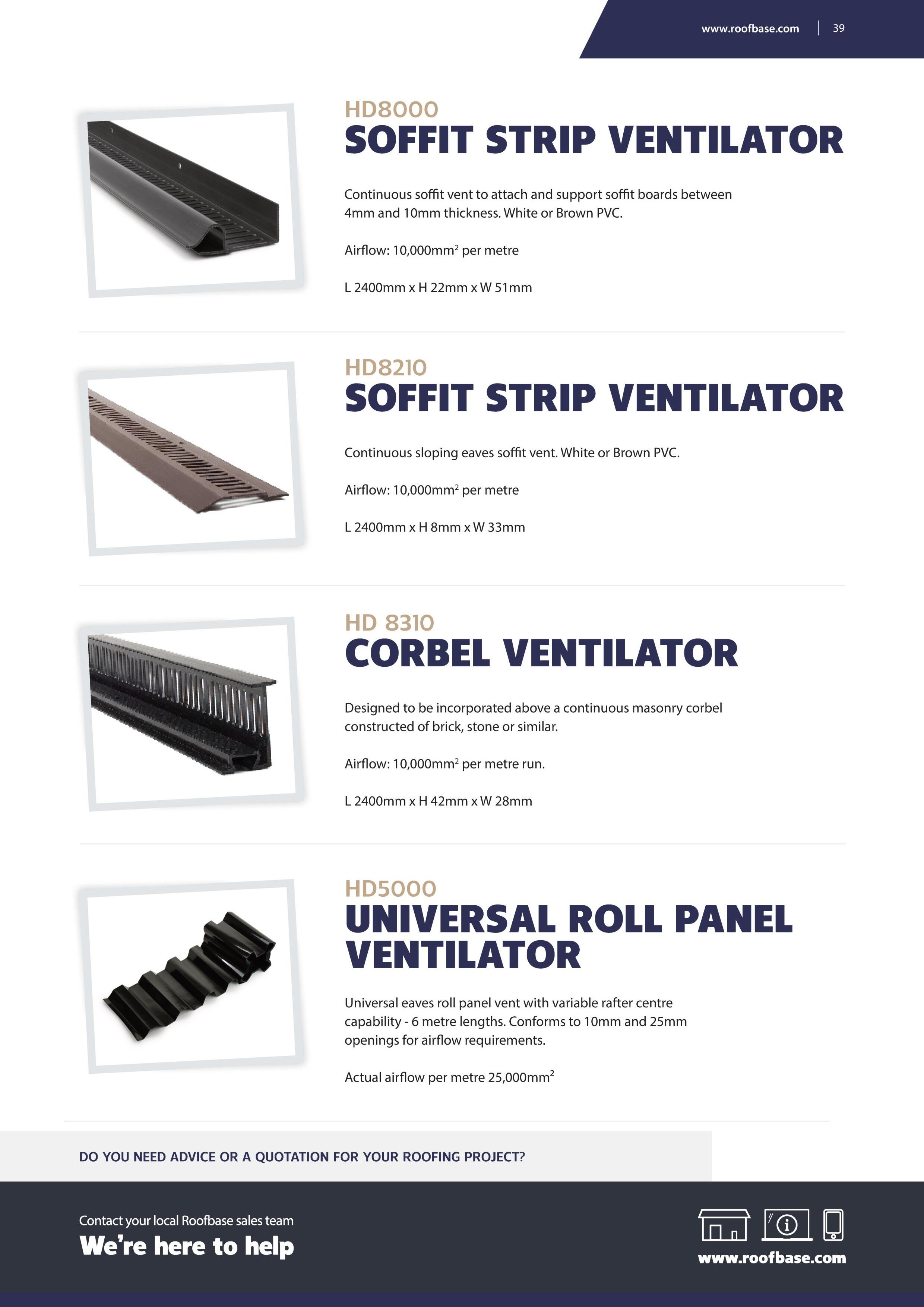 HD 3025VP Comprising 1 x 6m roll panel vent, 10 x 600mm underlay support trays and 6 x 1m lenghts of universal over fascia vent. Airflow at 10mm fixing position 25,000mm2