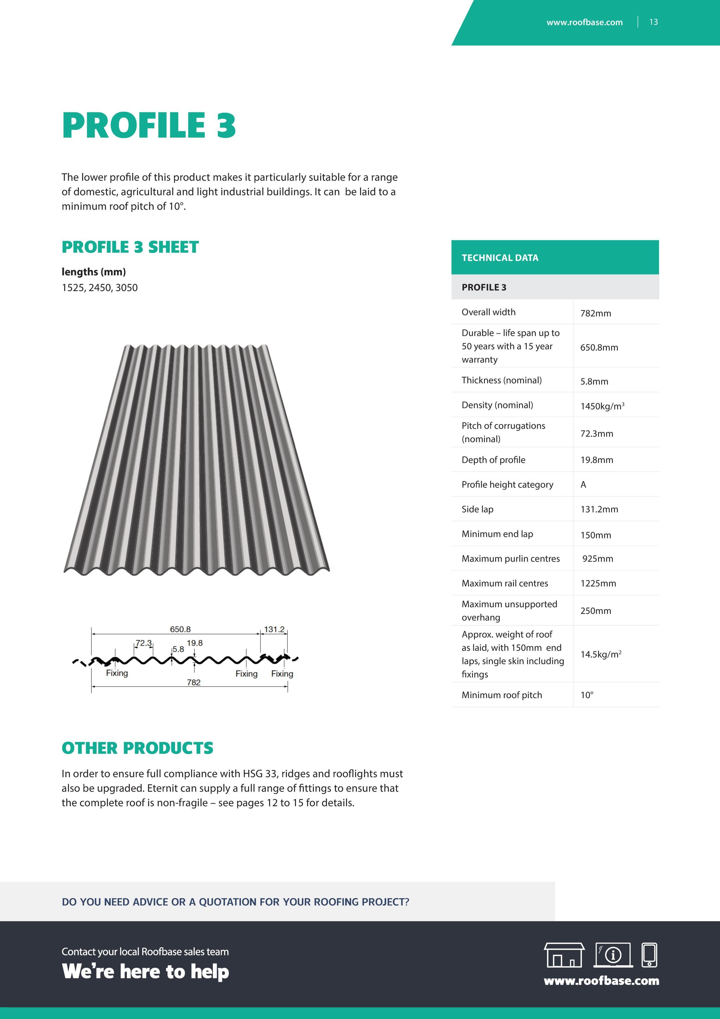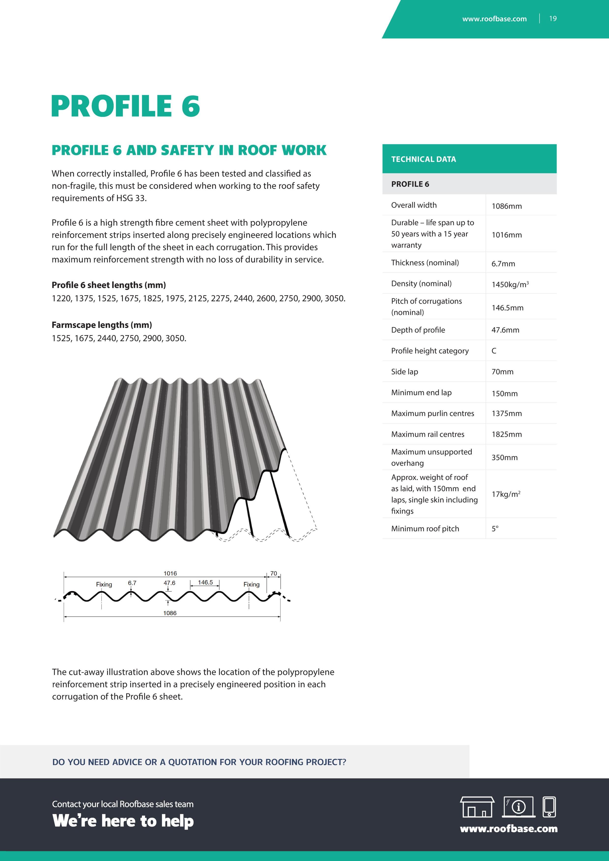Roofbase merchants now stock two ranges of Eternit profiled sheeting - Profile 6 and Profile 3 – to customers throughout the UK. The products are differentiated by the size of corrugation in the sheets; Profile 6 having larger corrugations than Profile 3. Both types of sheet are manufactured from a selected blend of Portland cement and water, reinforced with a mixture of both natural and synthetic fibres.